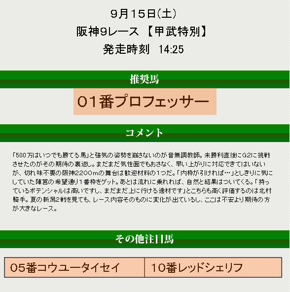 9月15日に配信された情報のうち、阪神9R甲武特別が的中していました。