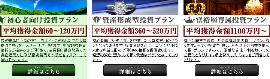2014~2015年度に「馬券売上の増加(市場拡大)」と「投資競馬業界の一掃(悪徳会社の排除)」を主な目的とした規制が入るということで、今公開している情報が来年には見れなくなっているかもしれないので、「今の内に登録して早い段階で最上級プランに上がった方が良いですよ」といったことをサイトの至る所で強調しています。