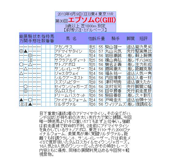 週末の無料情報を2レース公開していました。 能力、展開、騎手、状態、本社という項目に分けてそれぞれの項目で本命から注目馬までを予想しています。