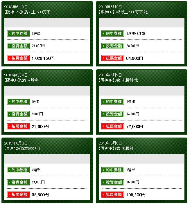 以前と比べると馬券種と投資金額が記載されていて、的中実績の内容が分かりやすくなって払戻金額の信用度が上がっている気がします。