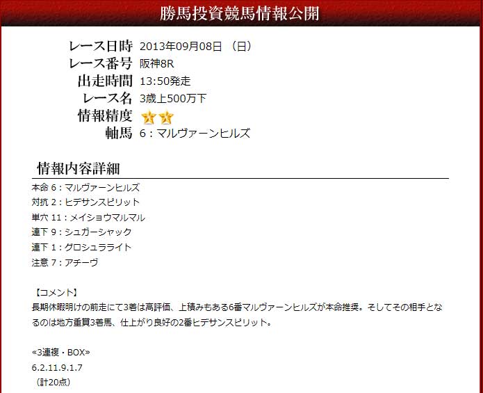 - 3か4レースやって回収が20万は軽く超えたと思います。対応も丁寧だし、何より気に入ったのは無料でも十分な情報と回収ができたことですね。かなりお勧めできるサイトです。