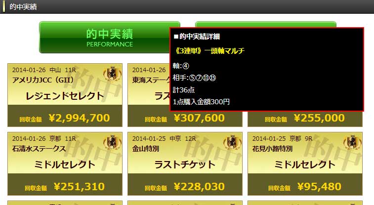 的中結果は画像のように日にちごとではなく、1レース毎に公開されています。それぞれどのプランで当たっているかが表記されているので、どのプランの情報がよく当たっているか、いくらくらい当たっているかなどをチェックできます。