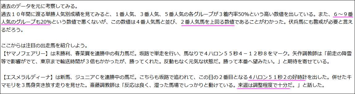 毎週重賞1レースの傾向注目馬2頭を公開しているコンテンツで、基本的には堅実な馬2頭を紹介しています。しかし、先週はヤマノフェアリー(3番人気)とエスメラルディーナ(6番人気)を選んでおり、ただ人気馬を紹介しているわけではないようです。